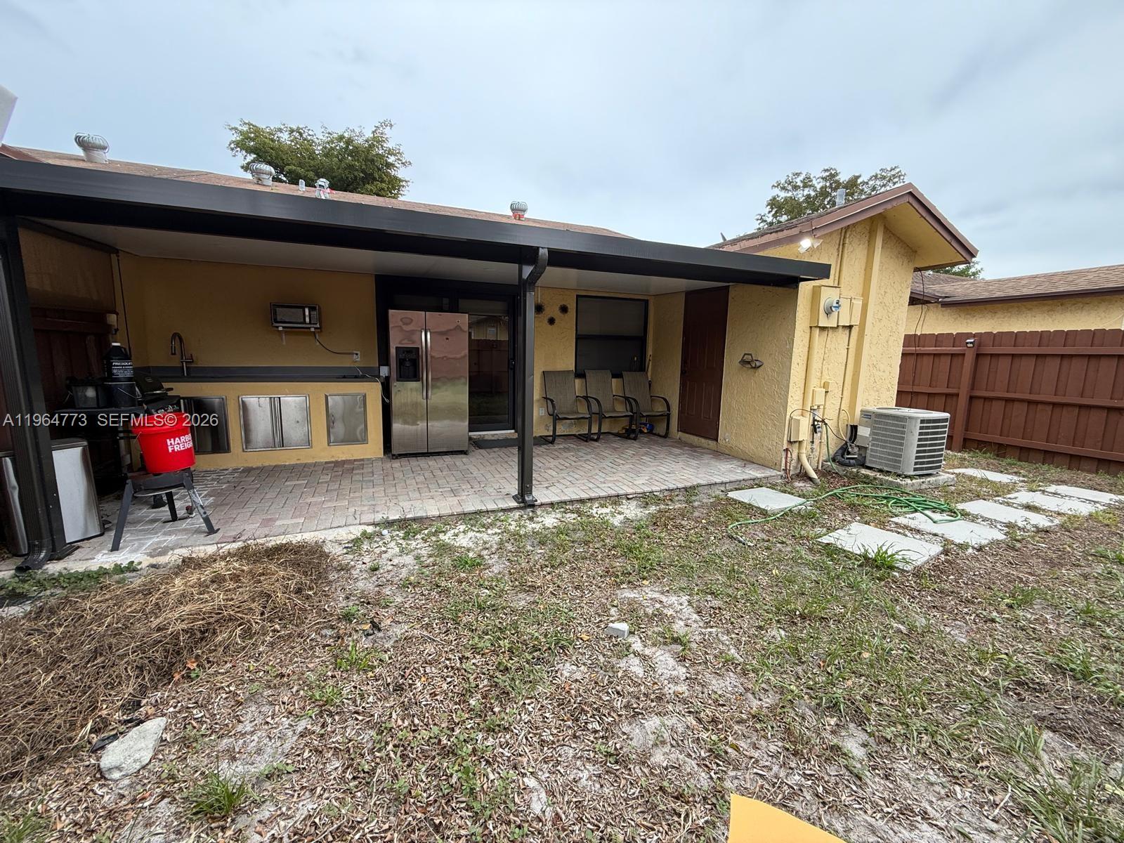 Move-in ready 3BR/2BA corner home with abundant natural light. Features granite countertops, stainless steel appliances, ceramic tile throughout, hurricane impact windows and doors, fenced backyard, paver patios in front and back, and an outdoor kitchen—perfect for entertaining. Laundry room with washer/dryer included. Private driveway fits up to 4 cars. Community amenities include clubhouse, pool, jacuzzi, tennis, ping pong & more. Conveniently located near shops, beach, I-95 & Turnpike.