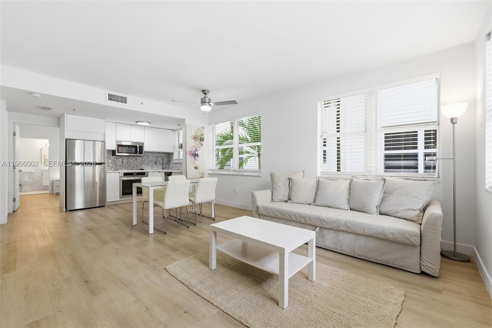 COMPLETELY RENOVATED, STUNNING SUPER BRIGHT 2nd FLOOR UNIT. This sunny and quiet corner 1 bedroom / 1 bathroom boasts an abundance of natural light! Beautiful new laminated floors throughout the entire apartment. Ultra modern and very spacious open kitchen / dining room features stainless steel appliances, quartz countertop, 2 sinks and a window overlooking a bright palm tree view. The tv / lounge area has a large couch and 3 windows. The large bedroom also has a huge window overlooking palm trees. The bathroom was designed with a frameless transparent shower door. The closet is very spacious and there is an in-unit washer & dryer. LOCATION! Ideally located between Lincoln Road & Espanola Way, near restaurants, shopping, cafes and only two blocks from the ocean! NO PETS & NO SMOKERS