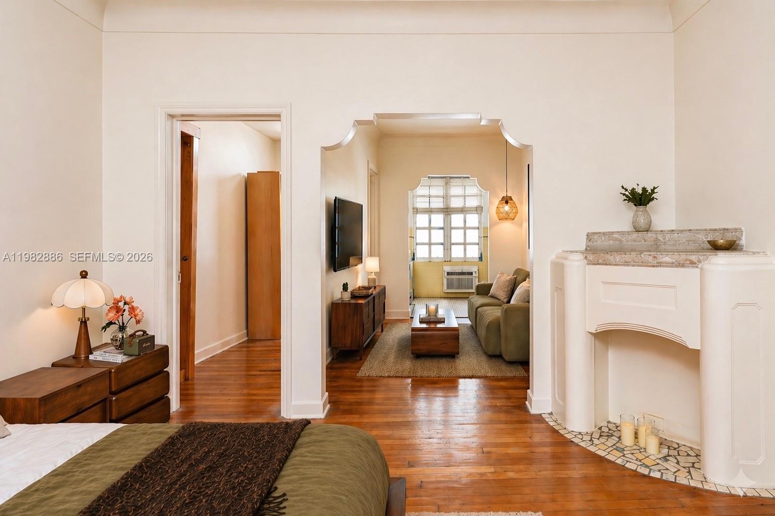 Charming studio apartment, designed by Miami architect Roy France, featuring a faux fireplace and a cozy sleeping nook/den. Just four blocks from the beach, this inviting space offers the perfect blend of tropical living and classic character. Enjoy beautiful garden & palm tree views, warm wood floors, a retro-style kitchen, and a vintage bathroom that enhances the home’s unique charm. Nestled in a lush, serene setting while still close to the ocean, shops, and dining—an ideal coastal retreat. Furnished (virtually staged) or unfurnished with washer/dryer on site.