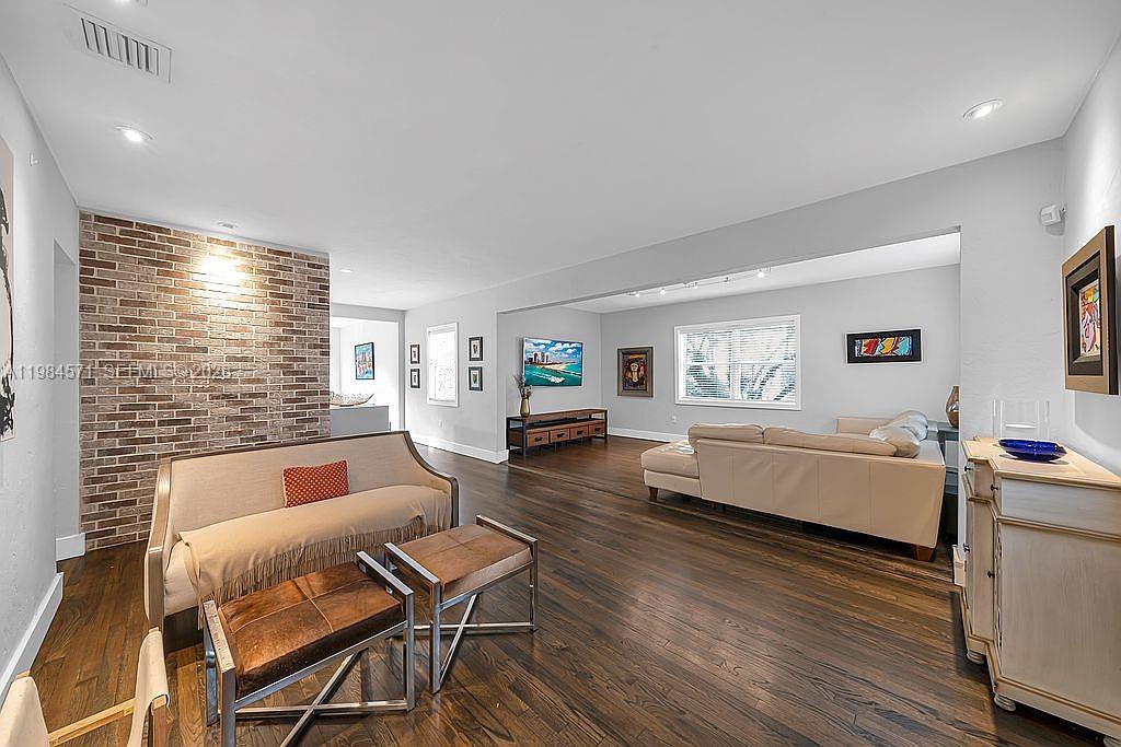 Impeccably remodeled single family home in quiet family neighborhood. This 3 Bedrooms / 1 bath residence features a charming chicago brick drive and walkway with a covered carport, elegant wood floors, hurricane impact glass throughout, quartz counter tops, stainless steel appliances, & wine cooler. The property's flow lends itself to easy family living, and social gatherings; Kitchen and formal dining area look out and lead to a large backyard deck with ample space for seating and your BBQ.