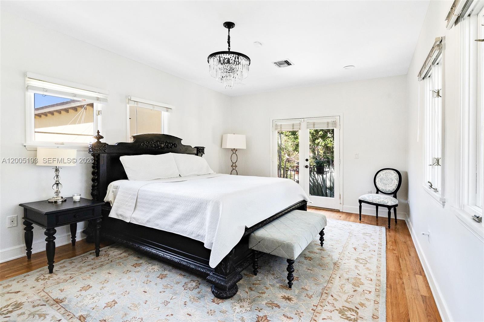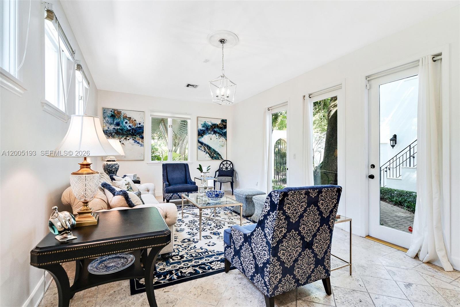 This stunning 3-story, 4-bedroom, 4-bath courtyard villa with a versatile room is located on a premier, quaint street in South Coconut Grove. Behind a walled & gated entrance, enter through exquisite Spanish cedar double doors into a perfectly designed split floor plan filled with an abundance of natural light. French doors open to a pristine lap pool & lush, private grounds with a covered outdoor space, creating seamless indoor & outdoor living. The kitchen features a gas range, with impact windows & doors throughout. The second-floor primary bedroom includes an ensuite bath. A separate private studio apartment offers a full bedroom & bathroom with its own grand exterior staircase. The third-floor tower suite is ideal for a home office or den.