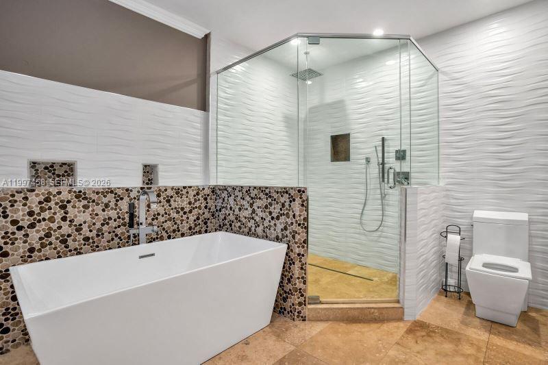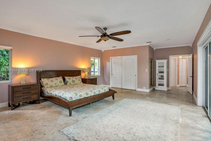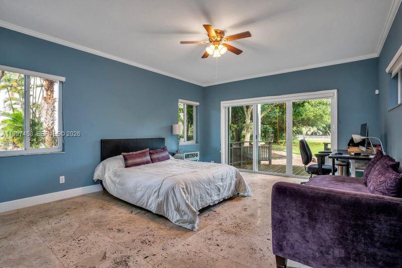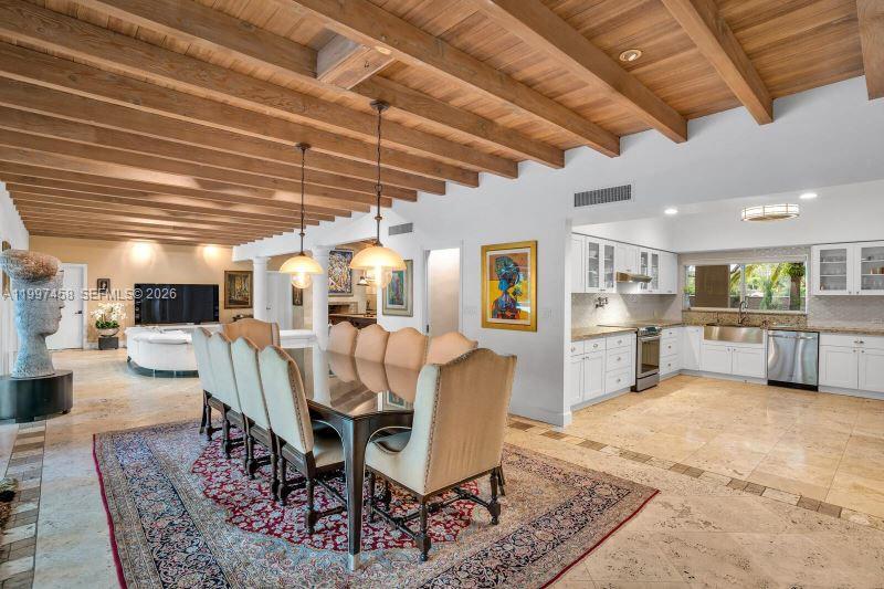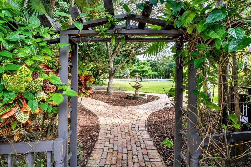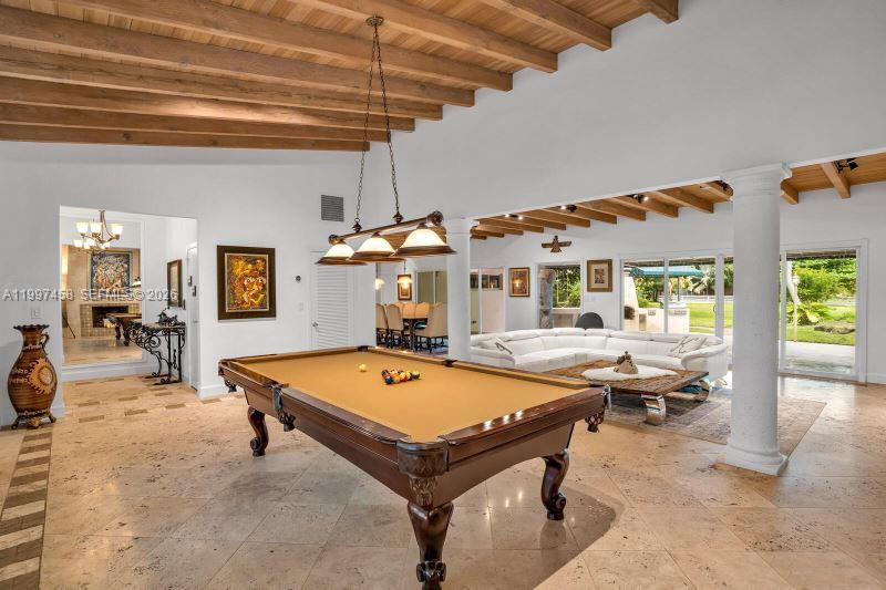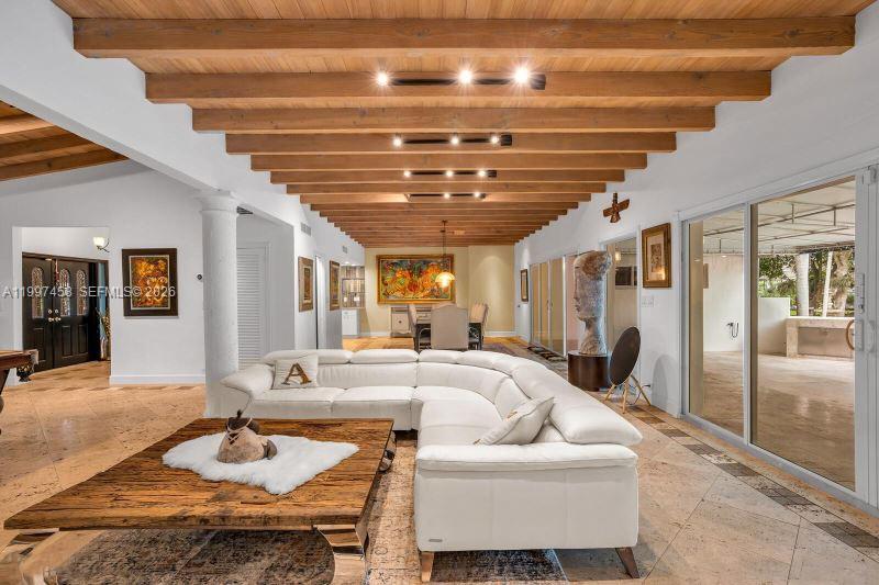 One-of-a-kind and genuinely Unique 5 bed, 5 bath home in South Miami with guest house, a one-story home with a huge patio, and a kidney-shaped pool surrounded by lush landscaping and Fruit Trees. Travertine floors throughout, large Main suite with double sinks, a large shower and a stand-alone tub, beautiful White Oak wood ceiling, fireplace, open floor through the living room, formal dining room, and the large open kitchen and Laundry room. The guest house has a separate entrance with a bedroom, living area, and kitchen area. This is a peaceful home in a quiet neighborhood yet close to everything. Dadeland Mall, the University of Miami, 20 minutes from Downtown Miami and Miami International Airport, and top-rated schools—Pool and Landscaping maintenance included.