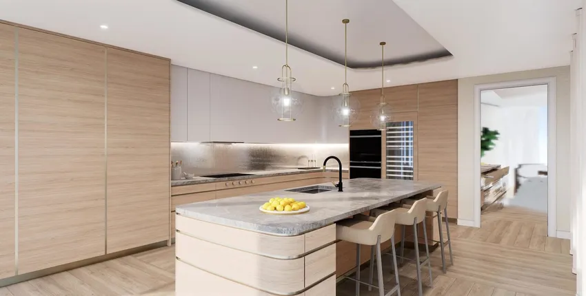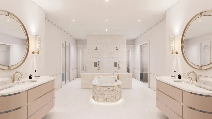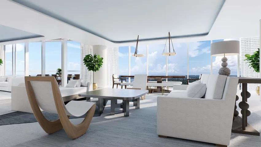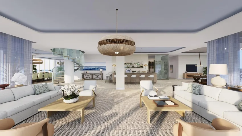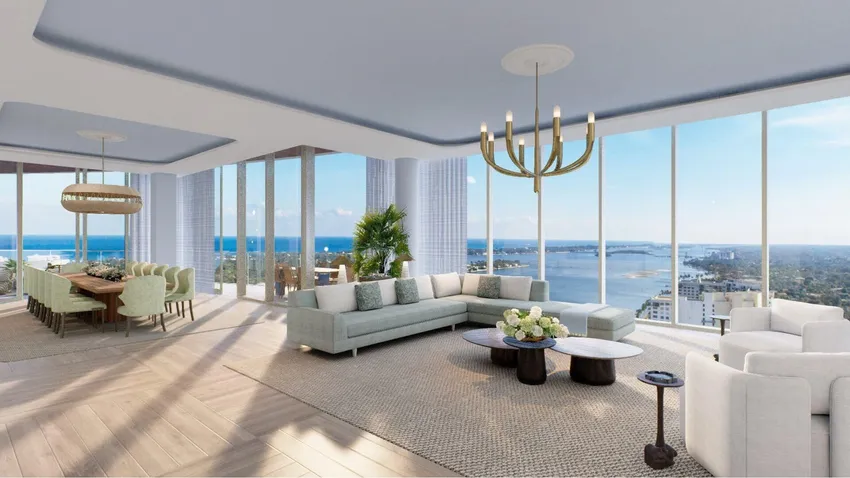 Четырех- и пятикомнатные квартиры площадью от 390 до 780 квадратных метров имеют сплошные стеклянные стены и более чем 3-метровую высоту потолков, которые открывают потрясающие виды на город и океан из каждой квартиры. На каждом этаже всего по две резиденции с индивидуальными планировками, оснащенными самыми современными отделочными материалами, оборудованием и бытовой техникой.